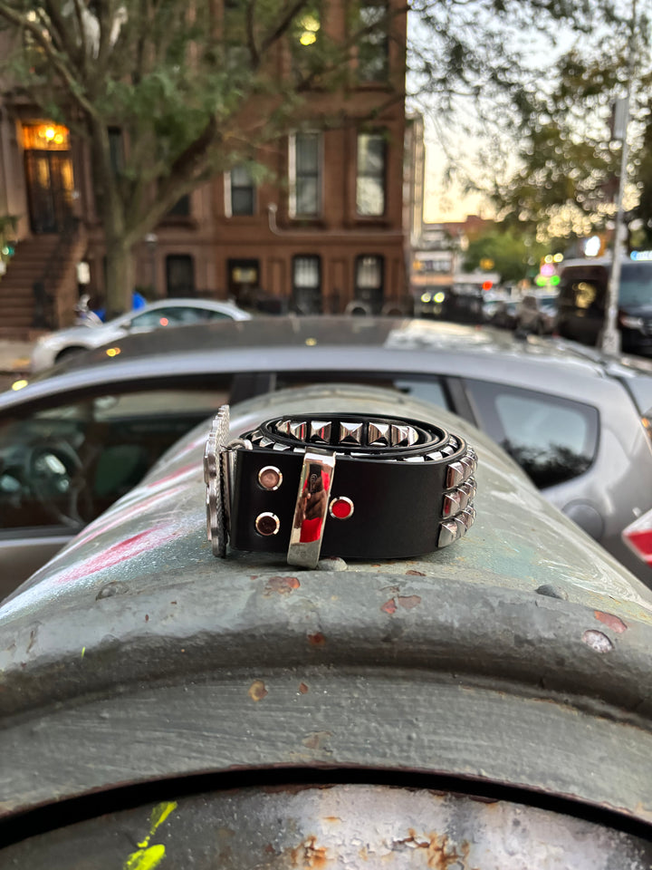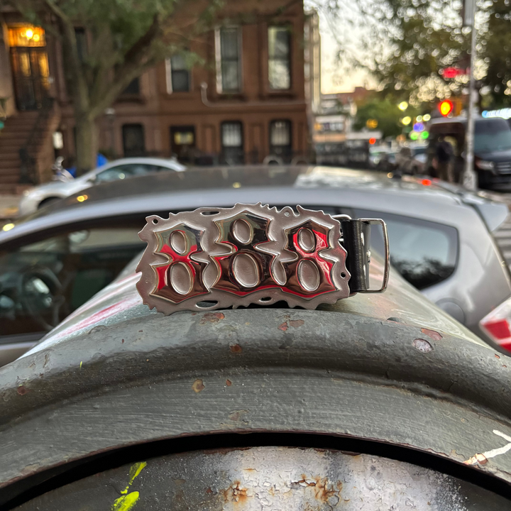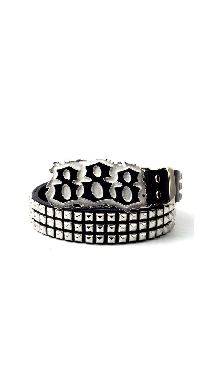 The Triple 8 Studded Heavyweight Belt comes with a bold all-silver 888 buckle and a strap fully covered in silver pyramid studs. Heavy, durable, and built to stand out, this belt is made to add shine and edge to any outfit.